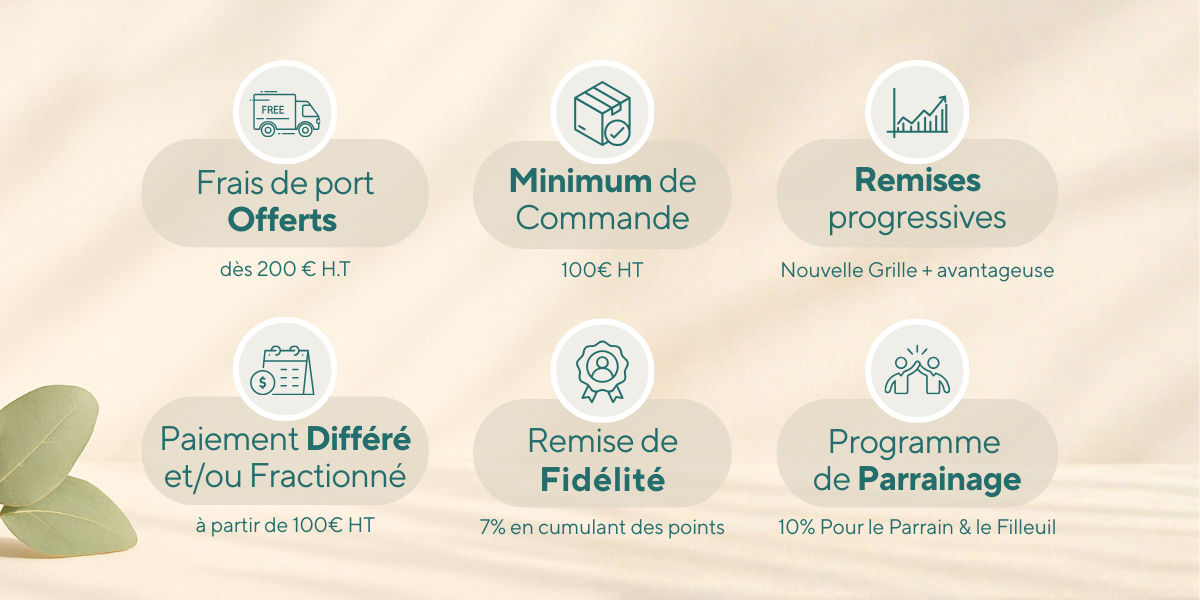 Pour vous aider à optimiser vos achats et vos marges, nous appliquons une grille de remises progressive selon le montant de votre commande : –3 % dès 250 € H.T. –5 % dès 300 € H.T. –8 % dès 600 € H.T. –10 % dès 800 € H.T.