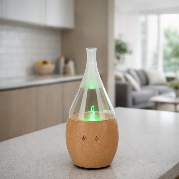 Sous son look élégant et moderne se cache un diffuseur par nébulisation programmable et efficace. Il est composé d’une base en bois et une verrerie artisanale mise en valeur par un éclairage LED.