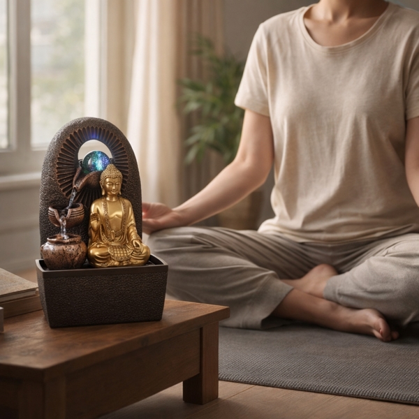 - Contenu: fontaine, vasque, boule en verre, statuette bouddha, pompe avec led.