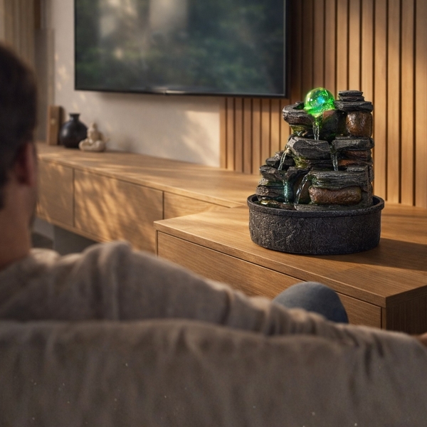 - Contenu: fontaine, vasque, boule en verre, pompe avec led.