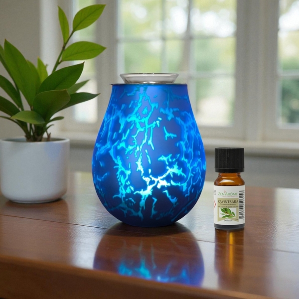 - Double fonction : diffuseur et lampe d’ambiance. - Belles finitions et verre bleu. - Eclairage réglable. - Entretien facile. - #Caractéristiques Techniques#- Diamètre: 11 cm.