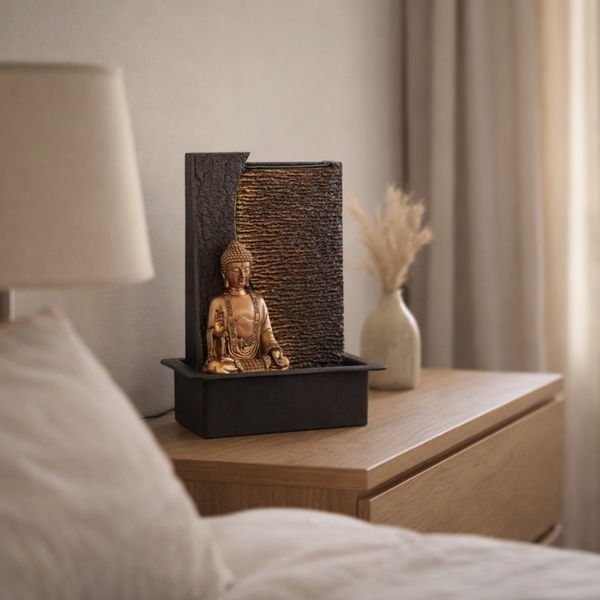 - Contenu: fontaine, vasque, statuette bouddha, pompe avec led.
