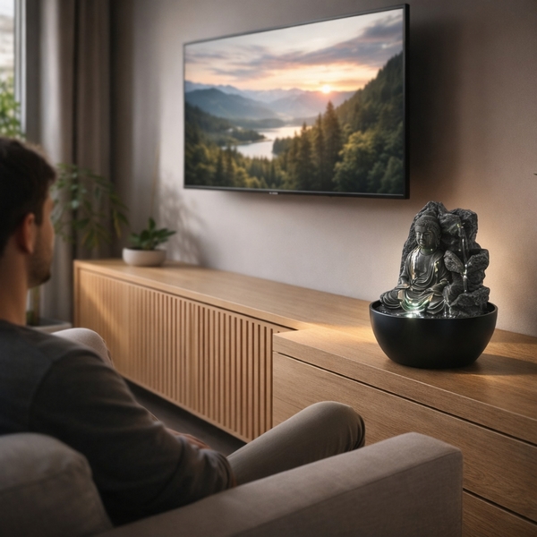 Le Bouddha en méditation, l'écoulement en cascade sur trois niveaux, l'éclairage à LED : tous ces éléments sont réunis pour faire de cette fontaine un objet de décoration unique. De plus, elle présente un faible encombrement et peut embellir n'importe quelle pièce de votre intérieur. Que ce soit sur une commode, sur la table de nuit, sur le bureau, à l'entrée, dans la salle de bain... elle trouvera sa place où que vous souhaitez. Une fontaine d'intérieur au petit prix qui permet de réaliser des ventes de coup de cœur.