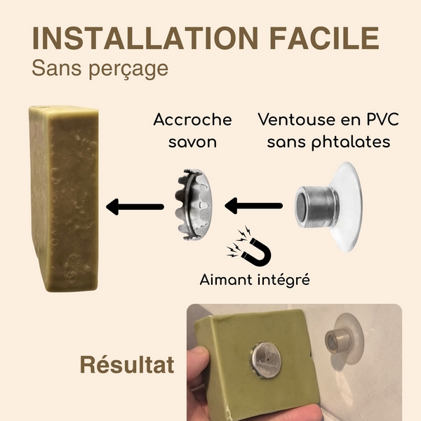 Compatible surfaces lisses : carrelage, miroir, verre, métal peint, marbre etc. Fabriqué en France. Conseils de pose : nettoyer/dégraisser, sécher, presser fermement la ventouse. Entretien : rincer et essuyer régulièrement, si besoin, détartrer la ventouse. Utilisation : insérer la capsule au centre du savon pour un maintien optimal